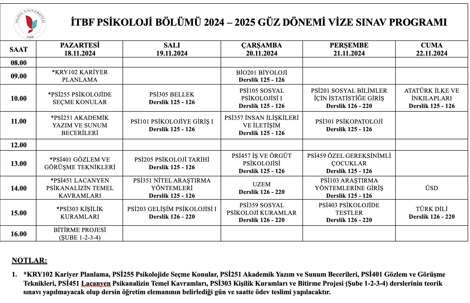 The midterm exam schedule for the Fall Semester of the 2024-2025 academic year is provided below. This announcement is for the information of all students.