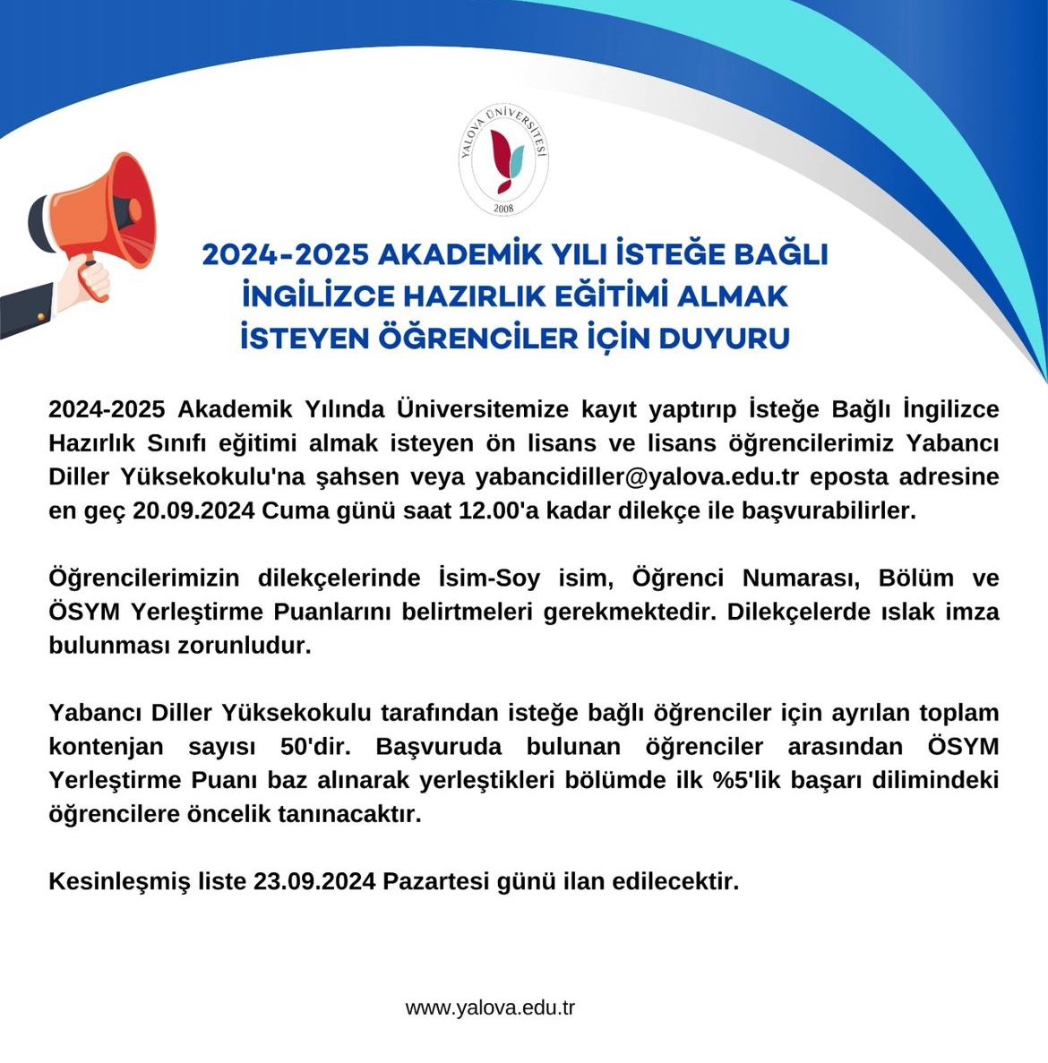 Associate and undergraduate students who wish to take the Optional English Preparatory Class in the 2024-2025 academic year must submit a petition in person to the School of Foreign Languages or via email to yabancidiller@yalova.edu.tr by Friday, 20 September 2024, at 12:00.