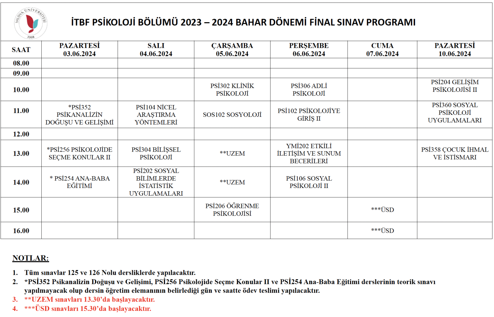 The updated final exam schedule for the Spring Semester of the 2023-2024 academic year is provided below. This announcement is for the information of all students.