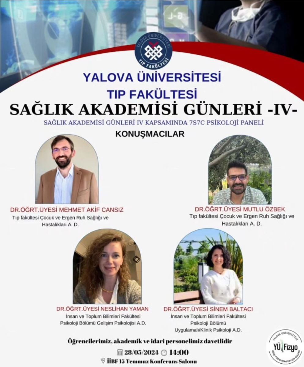 As part of the Health Academy Days organized in collaboration with Yalova University Faculty of Medicine and the Young Physiotherapists Club, a Psychology Panel will be held. Our department faculty members, Asst. Dr. Sinem Baltacı and Asst. Dr. Neslihan Yaman, will serve as speakers at this panel. We anticipate that this panel, where questions related to the field will be addressed, will be highly beneficial for department students. We invite all students, especially those from our department, to attend.