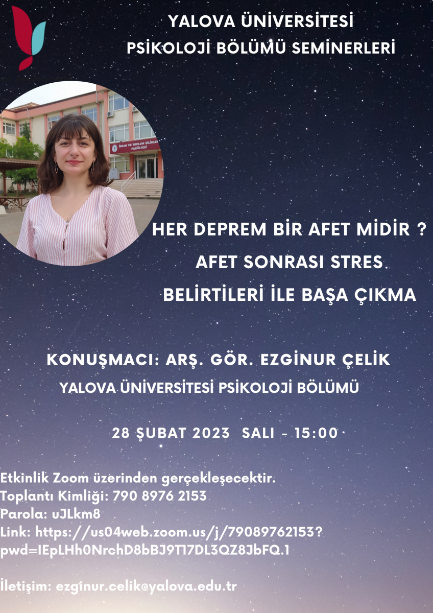 The seminar titled "Is Every Earthquake a Disaster? Coping with Post-Disaster Stress Reactions" will be held via Zoom on February 28, 2023, at 15:00, organized by Ezginur Çelik, Research Assistant at Yalova University, Department of Psychology. Everyone is welcome to attend.