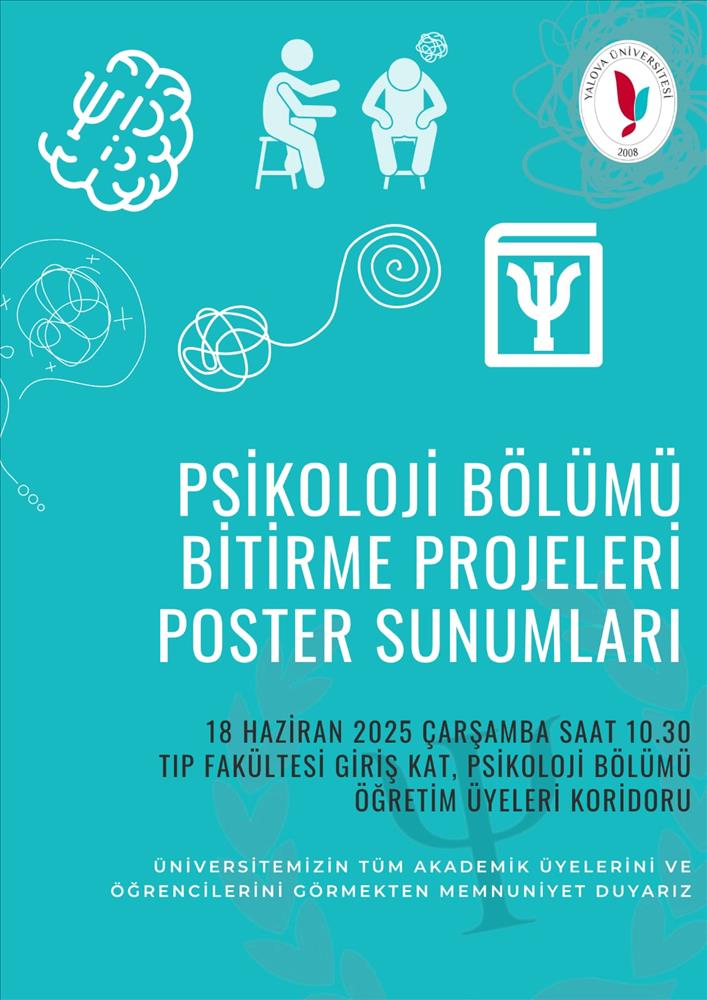 Poster presentations of the graduation projects by 4th-year students of the YU Psychology Department will be held on June 18, 2025, at 10:30 in the Faculty of Medicine, Psychology Department Faculty Corridor. We would be pleased to welcome all academic staff and students of our university to attend.