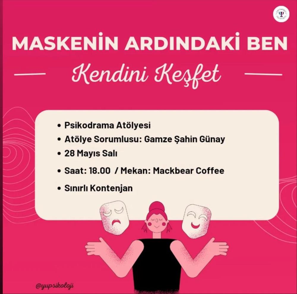 The event "The Self Behind the Mask: Discovering Yourself," organized by the Psychology Club, is a psychodrama session conducted by Specialist Psychologist Gamze Şahin Günay. The event has limited capacity, and the participation form can be accessed through the club's Instagram account (@yupsikoloji).