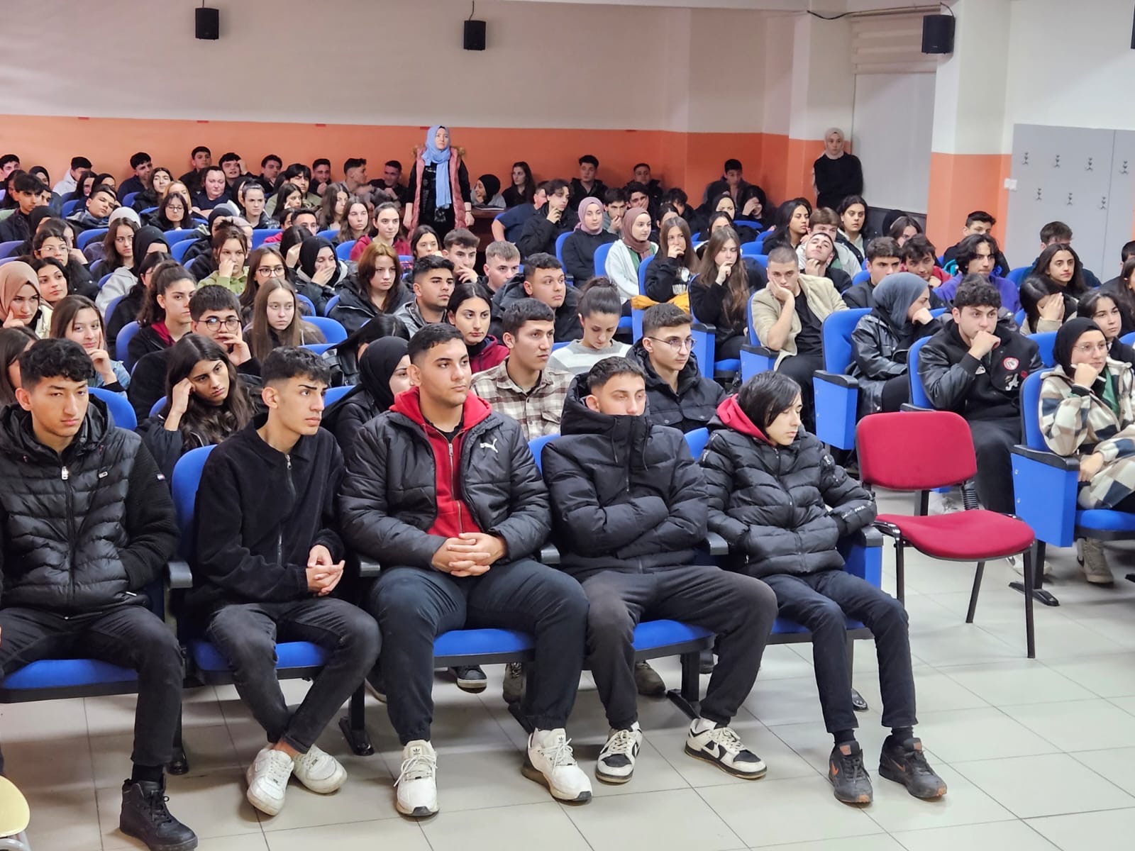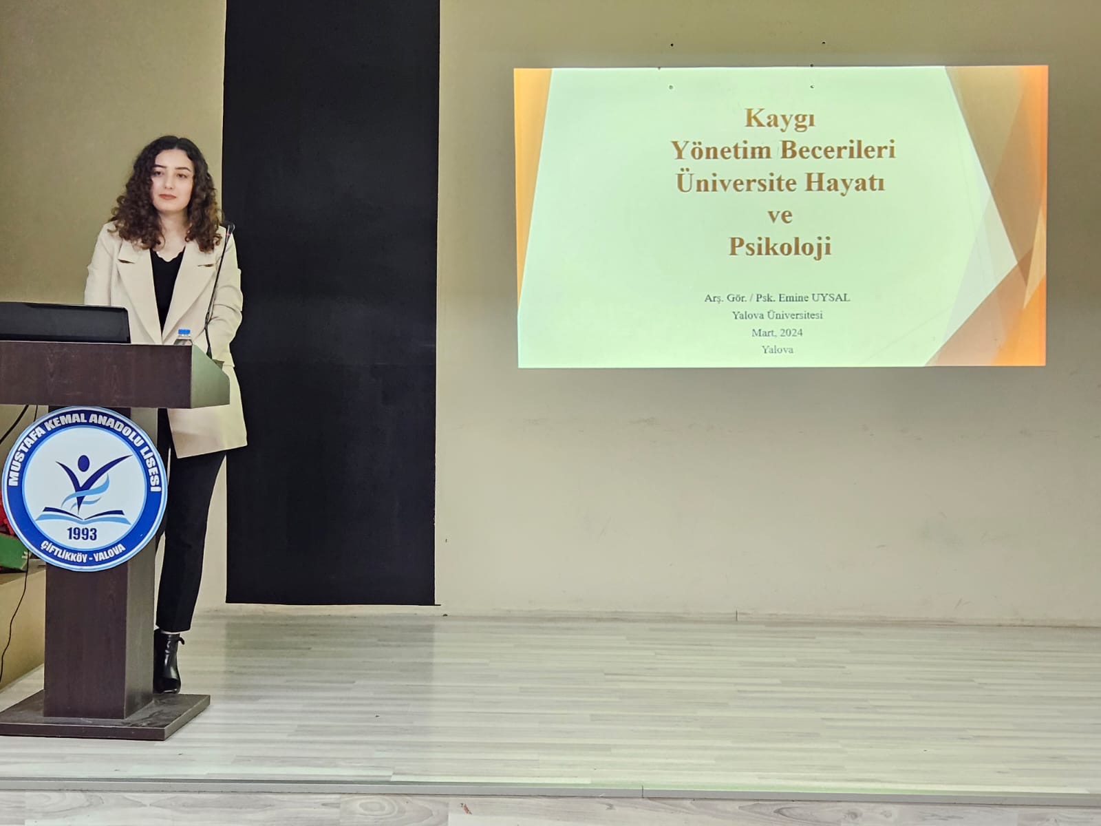 On March 6, 2024, our department’s Research Assistant Emine Uysal gave a seminar to senior students at Çiftlikköy Mustafa Kemal Anatolian High School. The seminar covered topics such as exam anxiety, undergraduate psychology education, and university life. At the end of the seminar, students had the opportunity to ask questions on the discussed topics. The seminar concluded with a presentation of flowers to Research Assistant Emine Uysal.