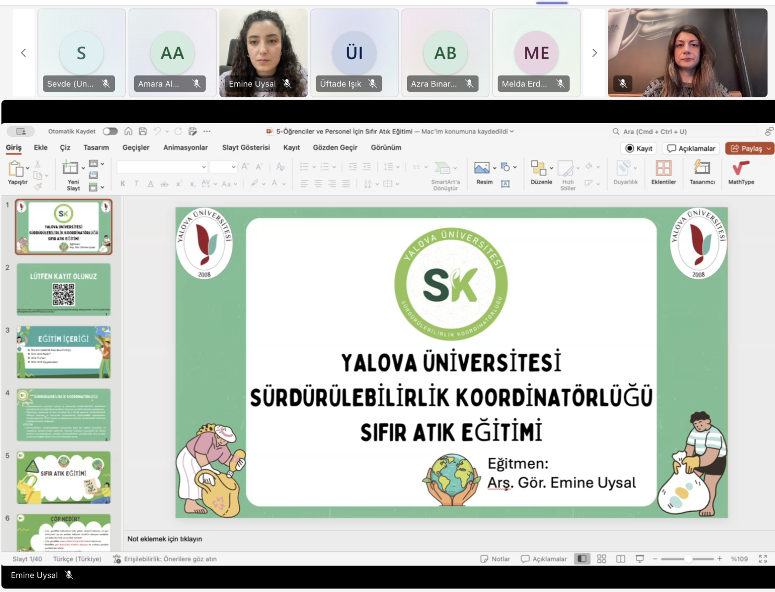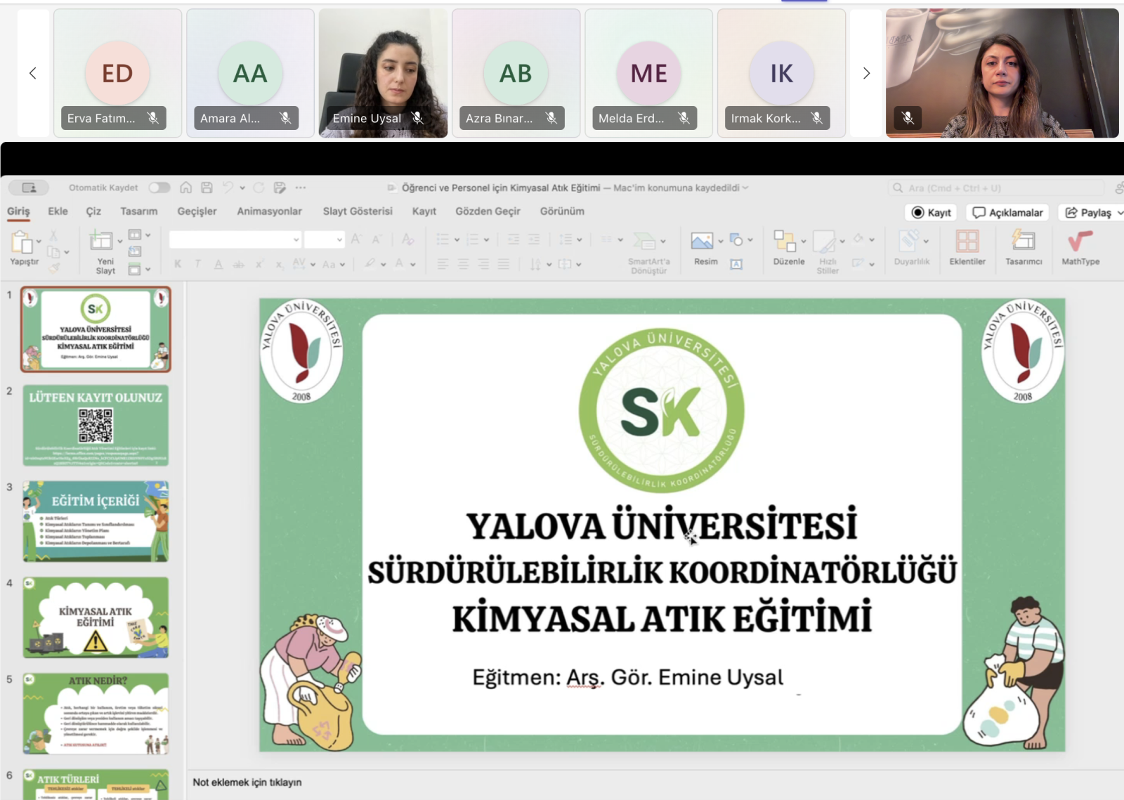 Research Assistant Emine Uysal conducted online sustainability trainings on Zero Waste, Chemical Waste, and Electronic & Battery Waste for the faculty members and students of the Psychology Department. During these trainings, participants were provided with information on the distinction between waste types, classification of waste, recycling processes, and individual responsibilities in promoting recycling.